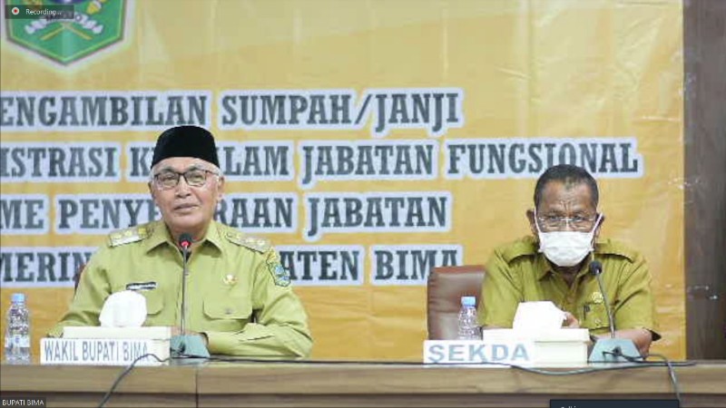 Sumpah Janji Jabatan Fungsional yang digelar secara tatap muka (offline) bagi 31 pejabat lingkup Sekretariat Daerah di Ruang Rapat Utama Kantor Bupati Bima, dan 272 pejabat secara tetapmaya (virtual) dari masing-masing perangkat daerah dengan menggunakan aplikasi zoom meeting.